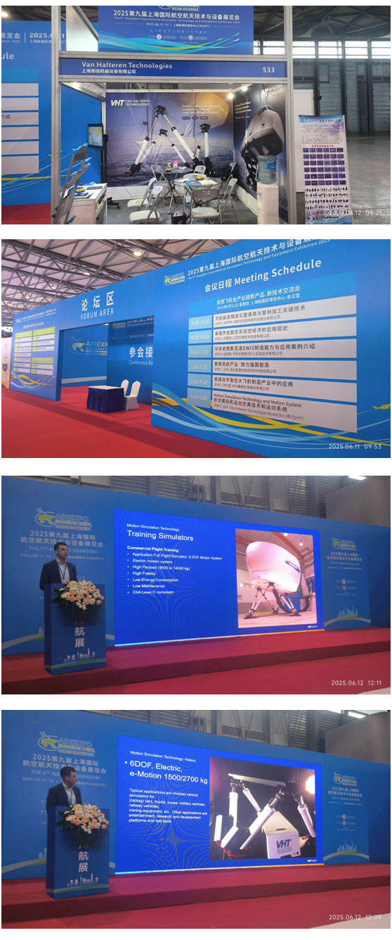 2025年6月,上海朗信攜手荷蘭VHT公司參加上海航展;繼德國力士樂之后接力繼續(xù)為中國民航航空模擬培訓(xùn)事業(yè)提供六自由度平臺解決方案。